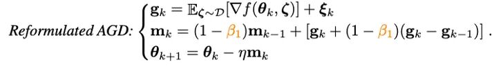 可以发现,m_k的更新将梯度与梯度的差分耦合在一起,但是在实际场景中,往往需要对物理意义不同的两项进行单独处理,因此研究人员引入梯度差分的冲量v_k:
