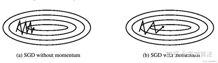 动量因子 的经验值为 , 这就意味着下降方向主要是此前累积的下降方向, 并略微偏向当前时刻的下降方向。在梯度方向改变时, momentum能够降低参数更新速度, 从而减少震荡, 在梯度方向相同时, momentum可以加速参数更新, 从而加速收敛, 如下图