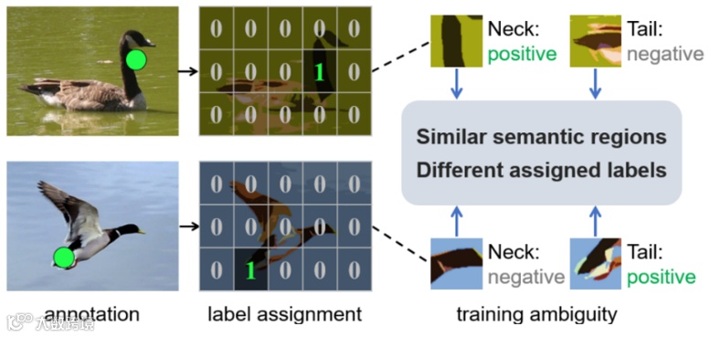通过深入分析POL任务,研究人员发现将物体表示为一个像素点时,必然存在多个候选的像素点,这就是POL语义歧义(语义方差)的问题:对于某个物体,具有不同语义信息的区域都可能被标记为正;对整个数据集,相似语义的区域就可能被标记地不同。以图2为例,都属于鸟类的两个物体,一个标记在颈部,另一个标记在尾部。在网络的训练过程中,一幅图像将颈部区域视为正例,而另一幅图像(标注尾部的图像)视为负例。这种现象就是语义歧义,这导致训练出来的模型性能差。