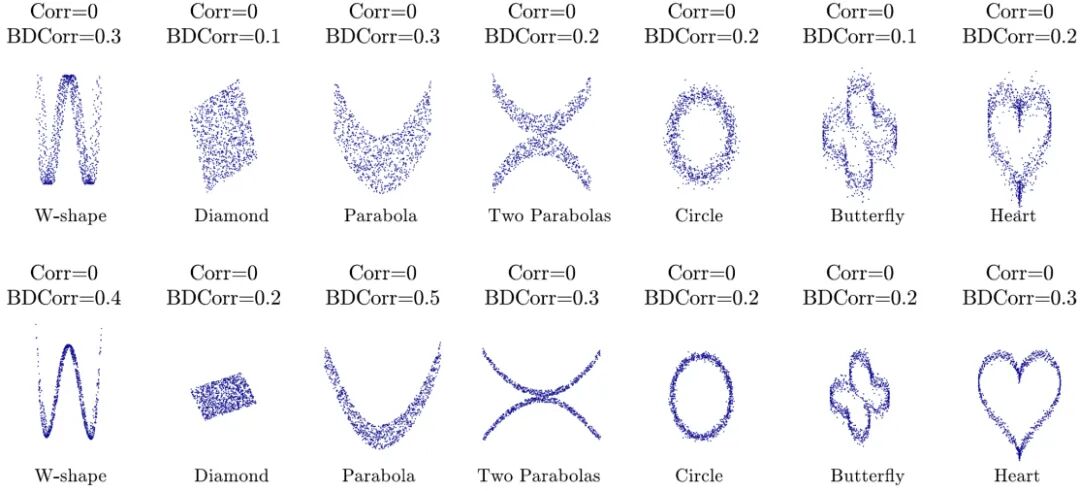 最后,该研究在一些线性和非线性相关的样本上展示了布朗距离相关系数(BDCorr)和经典协方差相关系数(Corr)上的建模相关性的能力。如图 9 所示,BDCorr 在线性相关的样本上和 Corr 具有相似的能力,且由于其非负性,BDCorr 无法反映方向性;二者都不能反映斜率的大小。但从图 10 中我们可以看出,对于所有的非线性相关样本,Corr 都等于 0,无法度量非线性相关性;而 BDCorr 可以刻画这种复杂非线性情况下的相关性。这一点充分证明了 BDC 在度量分布之间的相关性时,比经典协方差的能力更强。