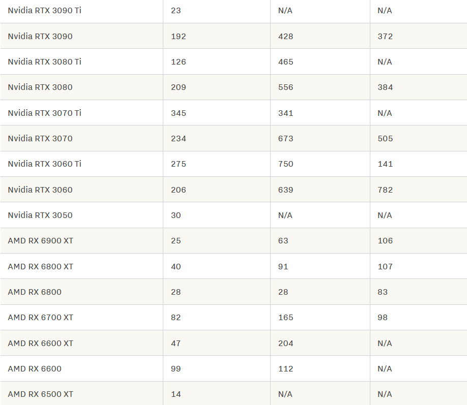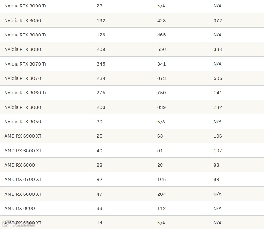英伟达:3060Ti > 3060 > 3070 > 3050 > 3070Ti > 3080 > 3080Ti > 3090