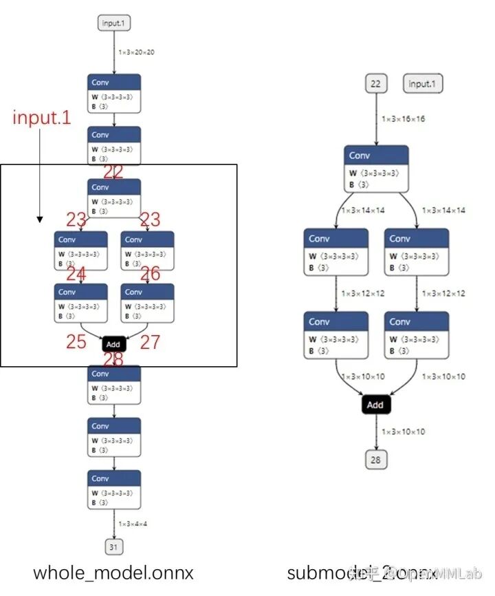 如果我们还是像开始一样提取边 22 到边 28 之间的子模型,但是多添加了一个输入 input.1,那么提取出的子模型会有一个冗余的输入 input.1,如下面的代码所示: