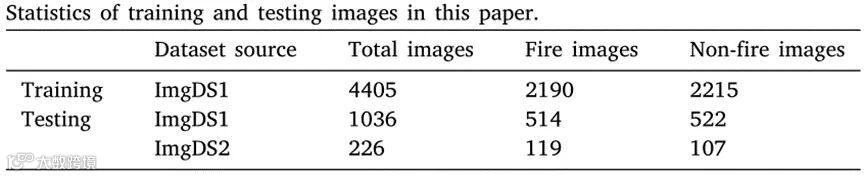 在实验中,文章使用了两个图像数据集(ImgDS1和ImgDS2)和一个视频数据集(VDS3)。ImgDS1用于培训和测试。它包含来自科西嘉火灾数据库(CFDB)的1135幅火灾图像(图卢兹等,2017年),从Foggia和Sharma的数据集(Foggia等,2015年)采样和增强的一些火灾和非火灾图像,以及来自互联网的一些火灾和非火灾图像(谷歌和百度)。此类非火灾图像包含一些难以与火灾图像区分的图像,如高照度的鲜红色房间、日落、红色房屋和车辆、不同黄色和红色阴影的明亮灯光等。ImgDS2包括119幅火灾图像和107幅火灾图像。这里使用ImgDS2作为基准数据集,用于测试并与其他已发布的方法进行比较。文章使用80%的ImgDS1图像进行训练,其余图像用于测试。在这种设置下,文章的模型接受了2190幅火灾图像和2215幅非火灾图像的训练。培训和测试数据统计见下表。