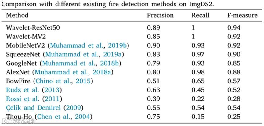 将文章提出的方法与参考文献中使用ImgDS2的现有火灾探测方法的性能进行了比较。虽然ImgDS2不是很大,但它非常多样化,并且有很多令人困惑的图像。文章将文章的方法与10种有代表性的方法进行了比较,包括4种基于CNN模型的方法和5种基于火的颜色、运动和形状特征等手工特征的方法。文章不与通用探测方法进行比较,因为探测火灾与COCO或其他通用数据集中的探测非常不同。使用精度、召回率和F-measure的评估指标,比较结果如下表所示。