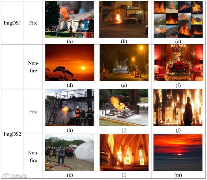 (3) 介绍了一个包含多种来源图像的多样化、平衡的火灾数据集。文章的数据集包括来自科西嘉火灾数据库(CFDB)的图像(图卢兹等人,2017年)、从福贾和夏尔马的数据集(福贾等人,2015年)中采样和增强的一些火灾和非火灾图像,以及来自互联网的背景中带有类似火灾物体的火灾和非火灾图像。