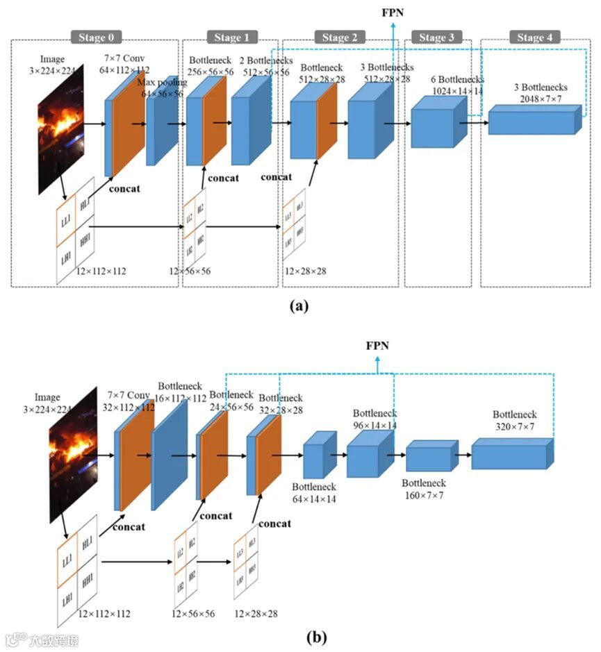 上图显示了小波CNN模型的概述,其中(a)是小波NET50,(b)是小波MV2。为了简单起见,文章使用3×224×224的输入图像来说明小波CNN结构。上图中的蓝色立方体代表ResNet50和MV2的卷积特征映射,橙色立方体代表小波特征。一般来说,FPN的计算成本和检测小目标的能力之间存在折衷。如果文章在FPN中重用更多的高分辨率特征映射,文章就能够检测更小的对象。在实际应用中,人们需要平衡FPN的层数和小目标的检测。在文章的实验中,文章发现上图中给出的FPN连接可以在文章的数据集上以相对较小的火提供令人满意的结果。