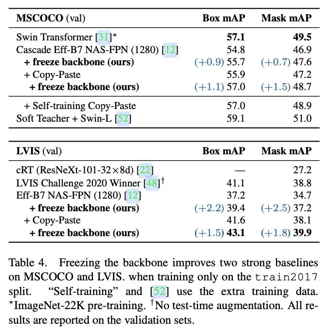 在数据增强方面,所有实验都采用了LSJ(Large scale Jittering),而最佳的EfficientNet结果则增加了Copy-and-paste增强。从冻结权值的实验结果来看,冻结权值能够很好地与两种数据增强策略配合,在只帮助检测特定组件进行训练的情况下改善整体网络性能。