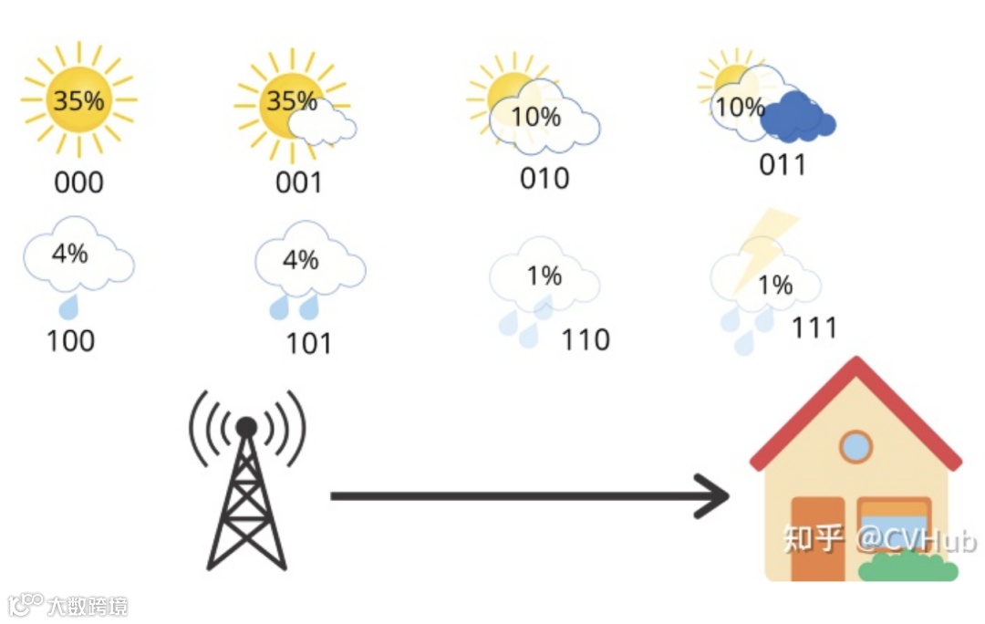 现在,我们只使用2位用于表示晴天或部分晴天,使用3位用于多云和大部分多云,使用4位用于表示中雨和小雨,使用5位用于大雨和雷暴。天气的编码方式是明确的,并且如果你链接多条消息,则只有一种方法可以解释位的顺序。例如,01100只能表示部分晴天(01),然后是小雨(100)。因此,如果我们计算该站每天发送的平均比特数,则可以得出: