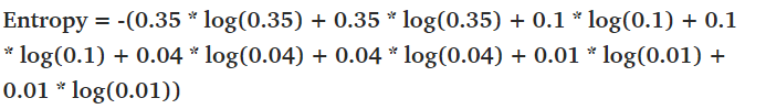 即每天有35%的机会出现晴天,只有1%的机会出现雷雨。我们可以计算这个概率分布的熵,我们得到2.23bits的熵,具体计算公式如下: