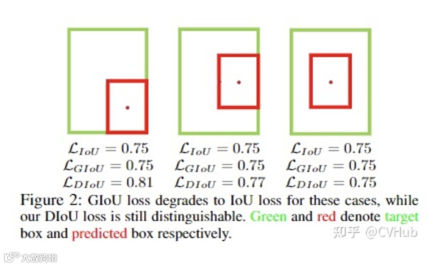 即距离IoU损失,全称为Distance-IoU loss,由天津大学数学学院研究人员于AAAI2020所发表的这篇论文 (https://arxiv.org/abs/1911.08287)中首次提出。上面我们谈到GIoU通过引入最小闭合凸面来解决IoU无法对不重叠边框的优化问题。但是,其仍然存在两大局限性:边框回归还不够精确 & 收敛速度缓慢 。考虑下图这种情况,当目标框完全包含预测框时,此时GIoU退化为IoU。显然,我们希望的预测是最右边这种情况。因此,作者通过计算两个边框之间的中心点归一化距离,从而更好的优化这种情况。