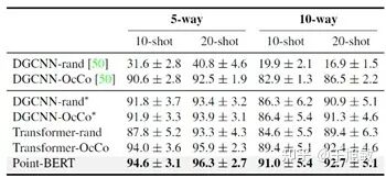 在点云物体分类任务上, Point-BERT采用最少的人为先验,超越了目前主流的点云学习模型;