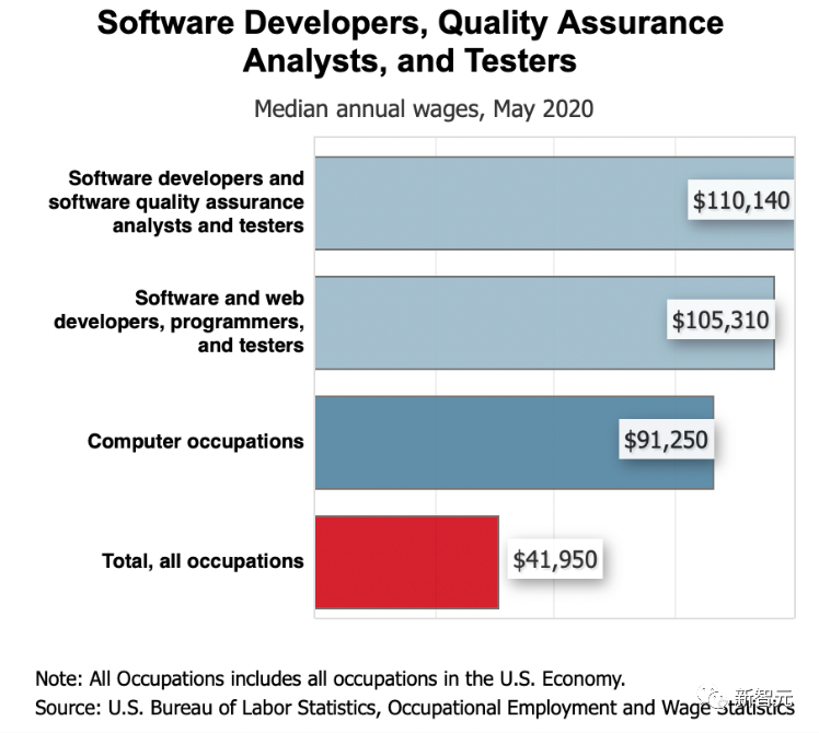 就比如软件开发人员的平均薪酬为110,140美元,而程序员的平均薪酬却只有105,310美元。