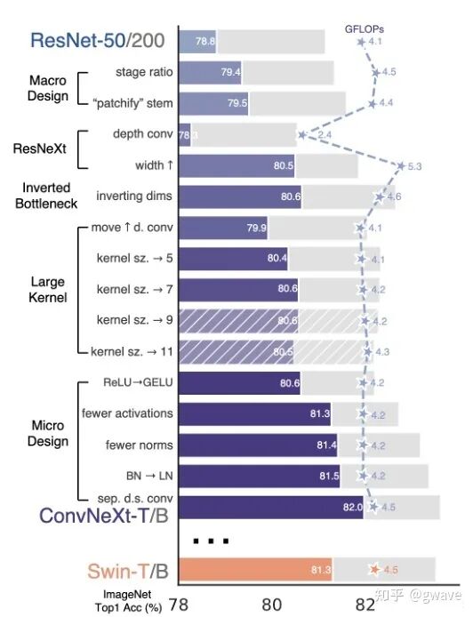 ConvNeXt 采用标准神经网络 ResNet-50 并对其进行现代化改造,以使设计更接近ViT,使用 AdamW 优化器,使用更多 epoch 对其进行训练,应用了花式数据增强技术和正则化(高斯误差线性单元GELU代替Relu),使用大卷积核和Inverse Bottleneck(中间粗两头细)都非常多的各种优化。