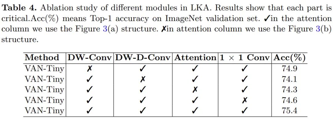 该研究首先用消融实验证明 LKA 的每个组成部分都是至关重要的。为了快速获得实验结果,该研究选择 VAN-Tiny 作为基线模型,实验结果如下表 4 所示。