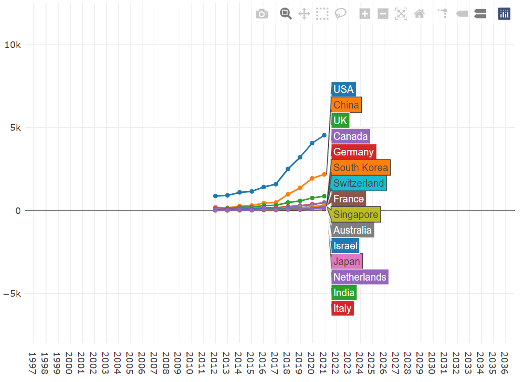 几乎所有排名靠前的国家都在继续增加其出版物数量,并在 2021 年创造了新的记录。对于美国来说,这一增长是最大的,进一步扩大了领先优势。