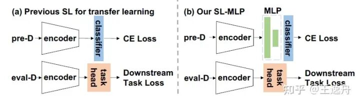 把竞争对手无监督学习在迁移能力上的情况剖析的差不多了,下一步自然就是修炼学到的知识。具体来说,参照无监督学习常用的做法,在预训练时,我们在SL的encoder和分类层之间加入了一个MLP,并在迁移到下游任务时丢弃掉,仅使用encoder进行迁移。