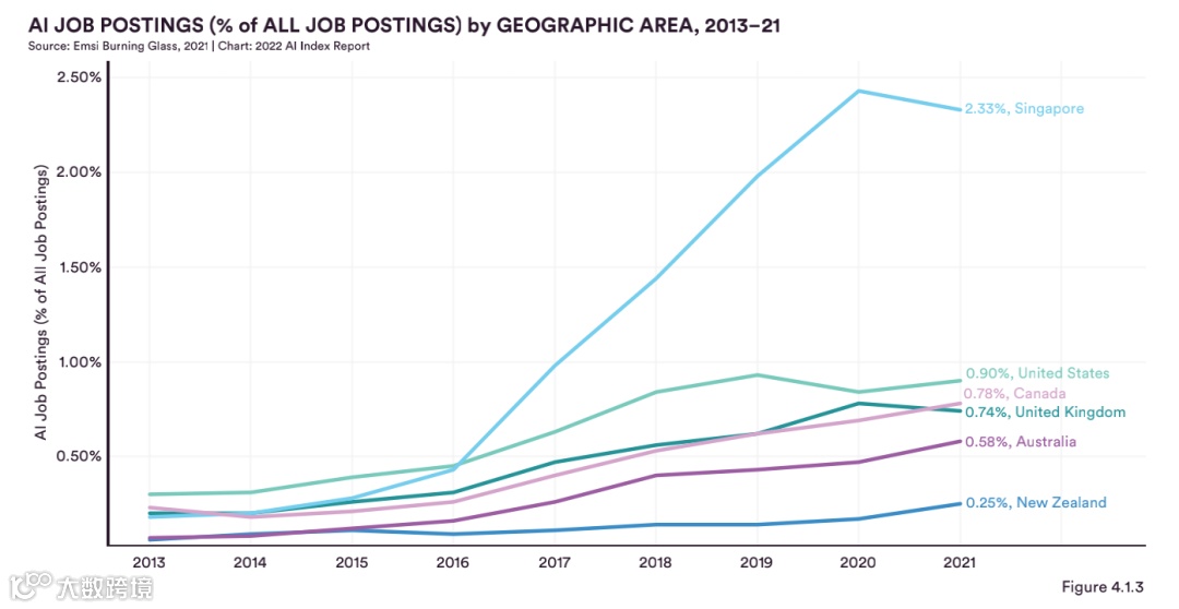 Burning Glass数据涵盖的六个国家对人工智能劳动力的需求在过去九年中显著增长。其中新加坡AI招聘岗位在总招聘岗位中占比2.33%,排名第一,美国0.90%排名第二。