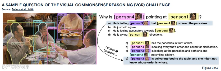 视觉常识推理,Visual Commonsense Reasoning(VCR)是AI领域的前沿热点问题,这是一项非常富有挑战的任务,包括认知、学习、推理,从单一的视觉问答、图像识别、动作捕捉等数据处理,上升到「跨媒体智能」,代表了计算机视觉理解的新基准。