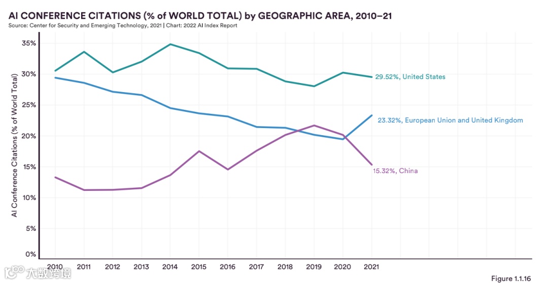 2022年人工智能指数报告发布了!这份报告中,中国在AI顶会论文上表现不凡,但在引用数量方面却低于美国、欧盟和英国。>>加入极市CV技术交流群,走在计算机视觉的最前沿