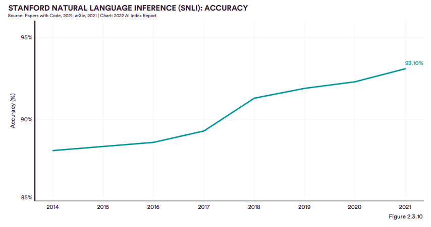 报告显示,2021年自然语言处理的精准度已达93.1%,而在2017年初就已经达到90%,这是在高起点的基础上实现缓增长。