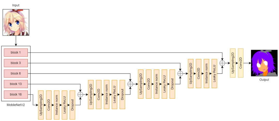 然而,这些数据在内容和风格方面高度重复,因为它们仅从 200 个样本中扩充而来。为了训练网络将分割掩码转换为高质量和多样化的动漫面孔,我们需要的不仅仅是 200 + 3000 个数据点。因此,我将首先使用这些数据来训练一个 U-Net 模型来学习从动漫人脸到分割掩码的翻译。然后我会将整个 Danbooru 肖像数据集输入到经过训练的 U-Net 模型中,以生成更多不同人脸的分割掩码。