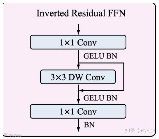 FFN的这个模块,其实和mbv2的block基本上就是一样的了,不一样的地方在于,使用的是GELU,采用的也是DW+PW来减少标准卷积的计算量。很简单,就不多说了,公式如下:
