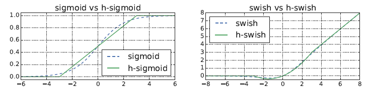 可以看出,如果按照公式来实现sigmoid对低性能的硬件来说非常不友好,因为涉及到大量的exp指数运算和除法运算,于是有研究人员针对此专门设计了近似的硬件友好的函数h-sigmoid和h-swish函数,这里的h指的就是hardware的意思: