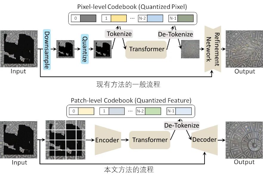 本文的方法旨在解决上述的问题。(1)利用auto-encoder代替下采样。auto-encoder中的encoder会将输入的图片分成独立的图片块,每块独立编码,避免信息交叉影响。Decoder负责从输入的量化的特征重构图片;(2)不量化。为了避免Transformer中的信息损失,输入到Transformer中的不是离散的token(即索引),而是encoder出来的特征。离散的token只用作Transformer的输出。图2对比了本文方法和现有方法的流程。