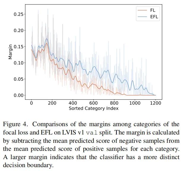 研究了EFL是否比罕见类别分类器上的Focal Loss具有更明显的决策边界。由于决策边界不能直观地显示,因此采用类别间正样本和负样本之间的经验边界来反映这些边界。边际是通过用每个类别的正样本的平均预测分数减去负样本的平均预测分数来计算的。由于EFL非常关注罕见类别的正负失衡问题,因此在EFL中,这些类别的阳性样本与阴性样本之间的差距应该很突出。如图4所示,在罕见类别中,阳性样本和阴性样本之间保持了较小的边缘。相比之下,提出的EFL增加了所有类别的边界,特别是对于稀有类别,带来了更明显的决策边界。