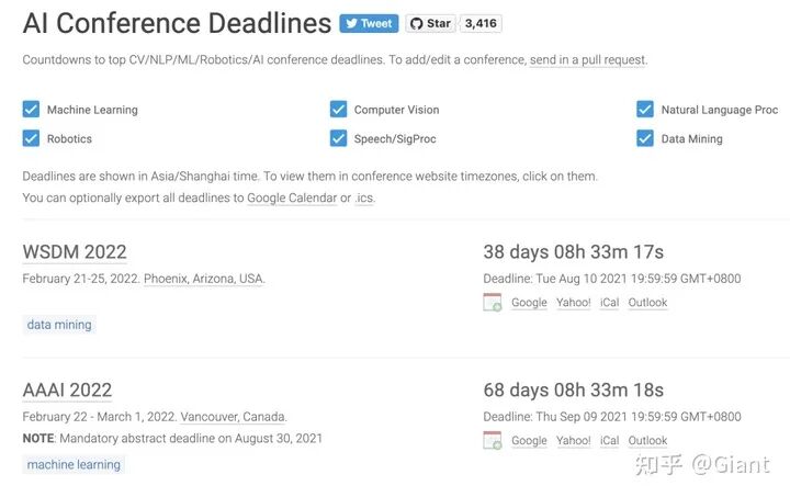 在选择投稿的会议后,务必要关注还有多久截稿,按时间制定相应的写作计划。这里可以参考 AI Conference Deadlines ——https://aideadlin.es/%3Fsub%3DML%2CCV%2CNLP%2CRO%2CSP%2CDM(一些国内会议不在上面)或查询会议官网。