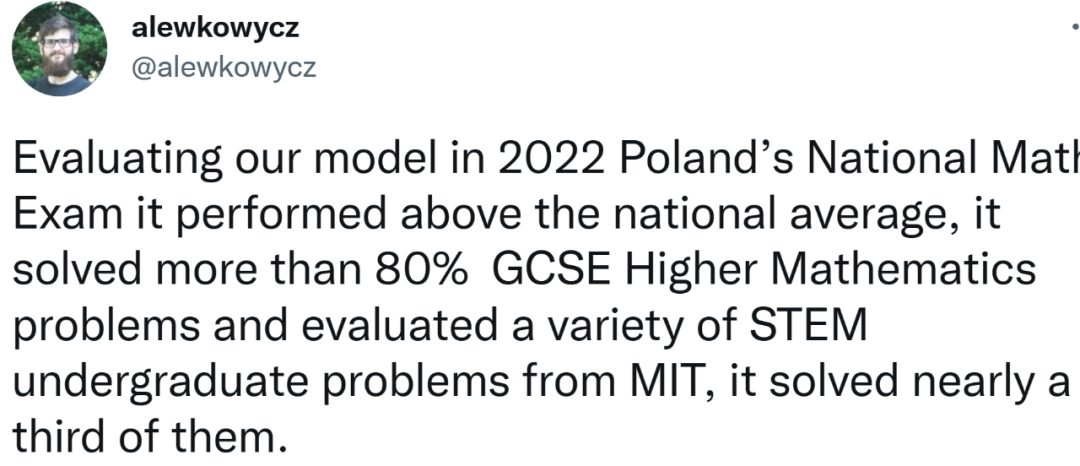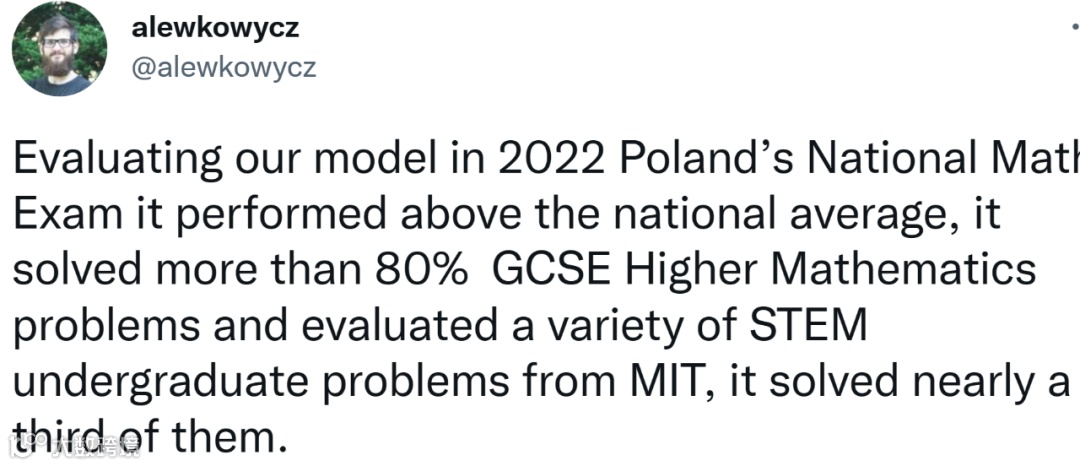 谷歌研究科学家、论文作者之一 Aitor Lewkowycz 给出了更具体的评估示例。他们在 2022 年波兰国家数学考试中对 Minerva 进行了评估,它解决了 80% 以上的 GCSE 高等数学问题,评估了 MIT 的各种本科级别的 STEM 问题并解决了其中的近三分之一。