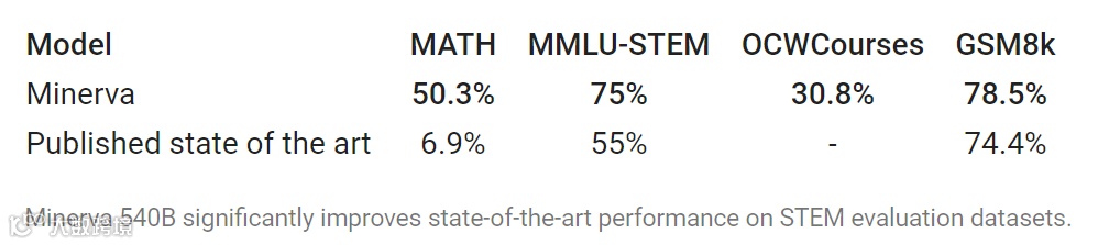 此外,谷歌还在 OCWCourses 上评估了 Minerva,这是一个大学和研究生水平的问题集合,涵盖了从 MIT OpenCourseWare 中收集的固态化学、天文学、微分方程和狭义相对论等各种 STEM 主题。