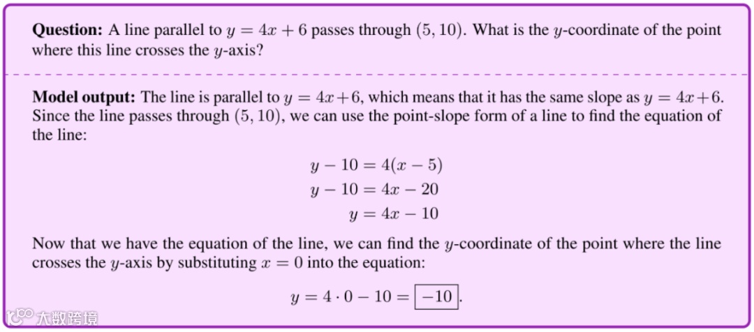 Minerva 解决数学问题:平行于 y=4x+6 的线,且穿过 (5,10)。问这条线与 y 轴相交的点的 y 坐标是多少?下面是 Minerva 解答过程: