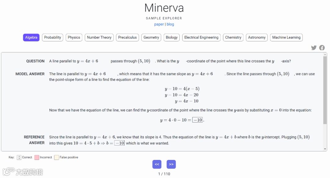 此次,谷歌还提供了交互式示例浏览器来探索 Minerva 的输出!从 Minerva 浏览器界面可以看出,Minerva 不仅可以解决代数问题,还能解决物理、数论、几何、生物、化学、天文学等众多问题。