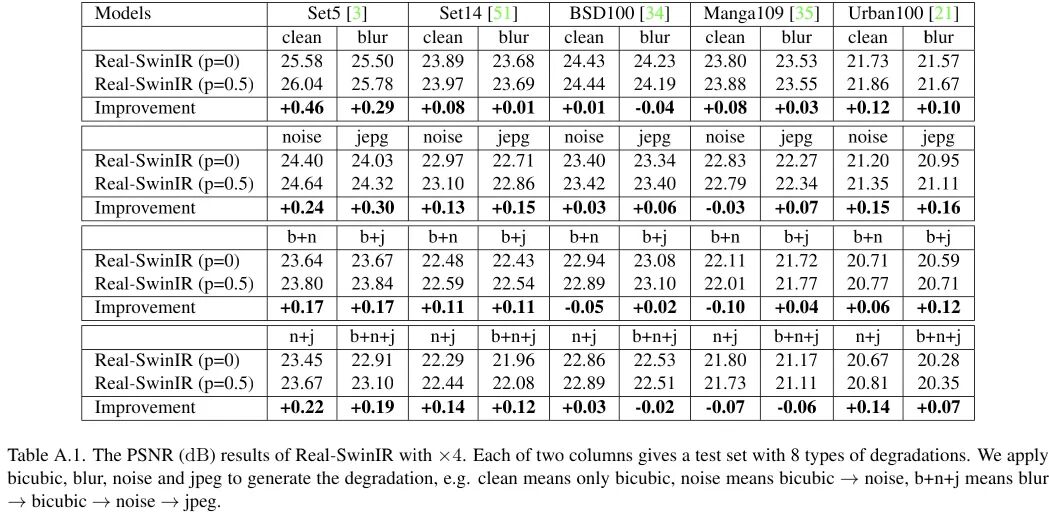 为验证:dropout会不会改变模型的收敛特性。作者以Real-SRResNet、Real-RRDB以及SwinIR进行了对比,见上图。可以看到:dropout不会改变模型的收敛特性,收敛曲线几乎一致,同时具有更优的性能。最后贴上所得dropout使用方案对SwinIR性能影响,见下图。可以看到:采用Dropout训练后,SwinIR的性能得到了进一步提升,最高提升达0.46dB。这进一步说明了所得方案的通用性。