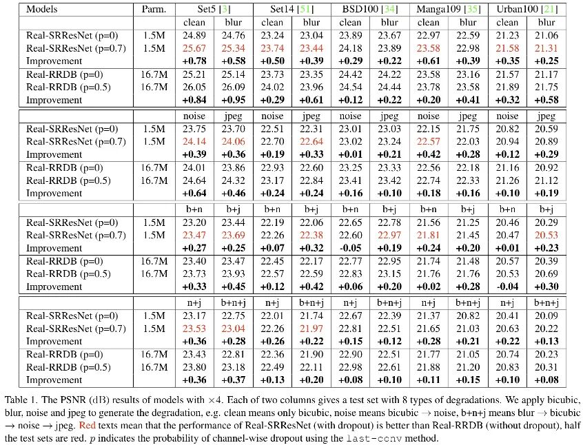 在该部分实验中,作者以bicubic退化配置探索Dropout的使用方式。上图给出了关于dropout实用位置、概率以及形式的实验结果对比(注:bicubic退化配置),从中可以看到: