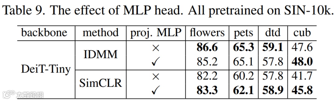 在下表 9 中,所有方法在 SIN-10k 上预训练了 800 个 epoch,然后在迁移到目标数据集时微调了 200 个 epoch。