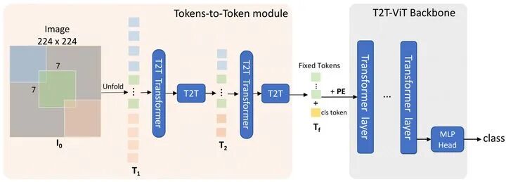 在T2T模块中,先将输入图像软分割为小块,然后将其展开成一个tokens T0序列。然后tokens的长度在T2T模块中逐步减少(文章中使用两次迭代然后输出Tf)。后续跟ViT基本上一致。