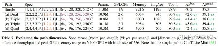 为了保持可比性的参数和FLOPs,增加路径的数量需要减少通道C或层数L(即,transformer encoder的数量)。作者通过减少C而不是L,从单路径(即CoaT-Lite baseline)扩展到triple-path。在消融研究中,验证了减少C比减少L获得更好的性能(见表5)。由于stage2的特征分辨率较高,导致计算成本较高,作者在stage2中将triple-path模型的路径数设置为2。从stage3开始,三路径模型有3条路径。