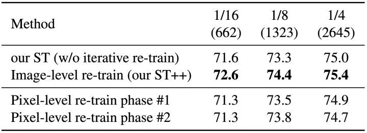 ST++的两阶段重训练分别是:1)在 上训练(Re-train #1);2)给 重新赋予伪标签后,在 上重新训练(Re-train #2)。下图展示了这两个阶段结束后各自的性能。