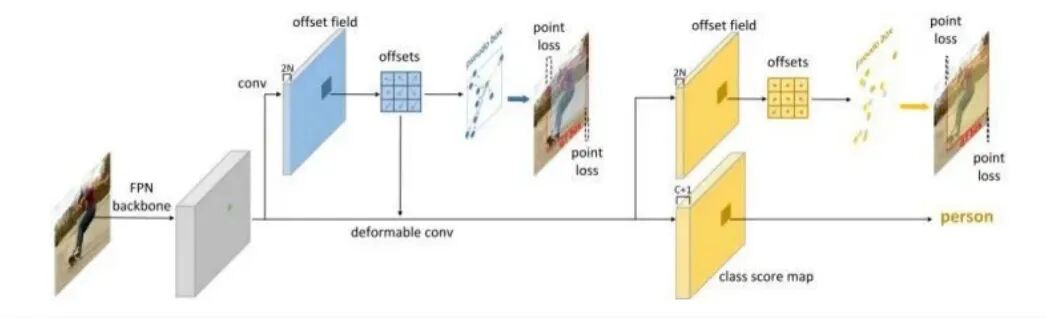 RepPoints检测器由两个基于可变形卷积的识别阶段构成,思路同faster RCNN一样,不断的修正目标检测位置: