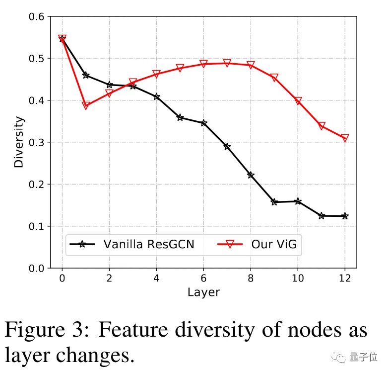 实验表明,用上新方法,当层数较多时ViG学习到的特征会比传统ResGCN更为多样。