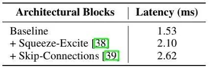 Activation Functions:上表对比了不同激活函数对于延迟的影响,可以看到:尽管具有相同的架构,但不同激活函数导致的延迟差异极大。本文默认选择ReLU激活函数。