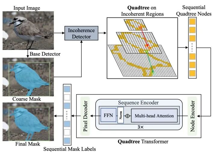 为了解决以上问题,本文提出基于Transformer的高质量实例分割算法Mask Transfiner。如图 2 ,不同于常规方法,Transfiner首先识别容易出错并需要优化的像素区域(黄色标识),并把这些像素点按四叉树结构表示。这些像素点是根据下采样物体mask的信息损失而计算得到,主要分布在物体边界或高频区域中,空间上不连续。我们把这些区域称为信息损失区域(Incoherent Regions)。它们位置稀疏,仅占总像素的一小部分。然而,通过实验分析,我们发现这一区域对最终分割性能非常重要。这允许Transfiner在预测物体mask的过程中只处理在高分辨率特征图上的少部分区间。