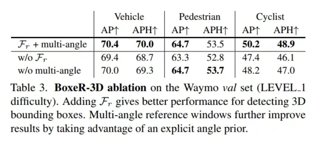 具体来说,作者发现旋转变换在添加到解码器层中的box-attention时最有效。表3还显示了BoxeR-3D编码器层中多角度与单角度参考窗口之间的比较。使用多角度参考窗口对车辆和骑自行车者类别产生改进,同时对行人保持稳定。这表明多头注意力中的每个头都能够有效捕捉不同旋转角度的信息。