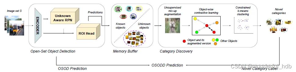在之前的 open-set object detection (OSOD) 中,除了检测识别已知物体外,还会检测一些未知类别的物体,但把所有未知的物体都归到 “未知类”。该论文提出的 Open-Set Object Detection and Discovery (OSODD),不仅可以检测未知物体,还可以挖掘它们潜在的类别。OSODD 采用了两阶检测方式,先对已知物体和未知物体进行预测,然后通过无监督和半监督方式学习预测到的物体的表征并进行聚类,从而挖掘出未知物体的类别。