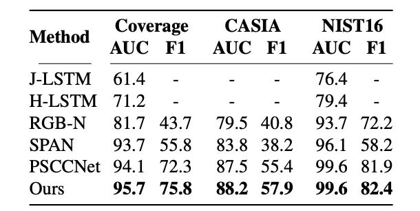 我们参考了现有的工作,利用COCO和Paris StreetView数据集合成了伪造的图像作为预训练数据,并在现有的图像篡改数据集上进行finetune,在下表中我们展示了我们的方法和现有方法的结果对比。