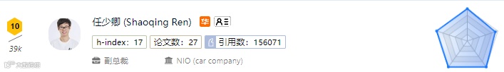 任少卿,蔚来汽车公司科学家,毕业于中国科学技术大学与微软亚洲研究院联合培养博士班,主攻图像处理和机器视觉方向的研究。和何恺明、孙剑等人提出适用于物体检测的高效框架 Faster RCNN 和图像识别算法 ResNet。