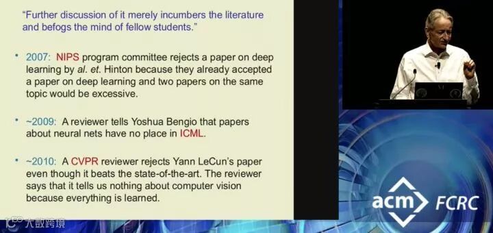 P.S. 其实好的工作被拒也是常有的事情,一些工作想法太超前,或是不符合会议评审的品味,或者一些更奇怪的原因,就被拒啦~Hinton之前也吐槽过(图片截取自讲习班视频:https://fcrc.acm.org/turing-lecture-at-fcrc-2019: