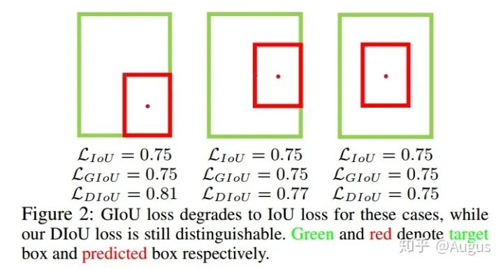 当目标框完全包裹预测框的时候,IoU和GIoU的值都一样,此时GIoU退化为IoU, 无法区分其相对位置关系,如下图三种情况GIOU loss是完全一致的。